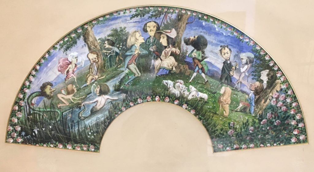 Entre autres talents, soulignons celui de la peinture et admirons cet « éventail des caricatures » , gouache réalisée en 1837, à deux mains avec l’ami Auguste Charpentier