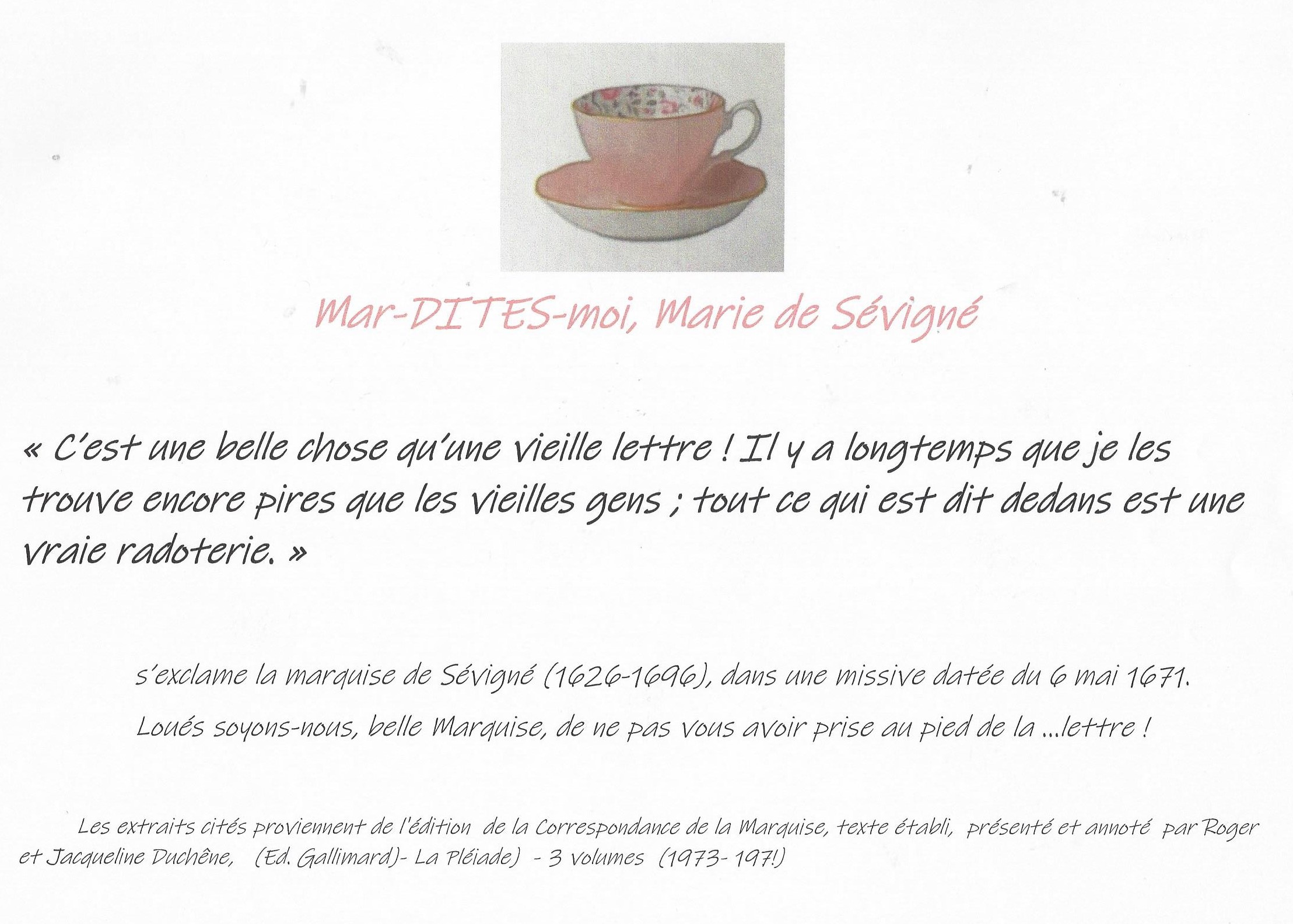 Mar-DITES-nous, Marie de Sévigné,. Rendez-vous, mardi 5 mai: Nous passerons aux crible et loupe cette lettre de confinement que l’on vous prête